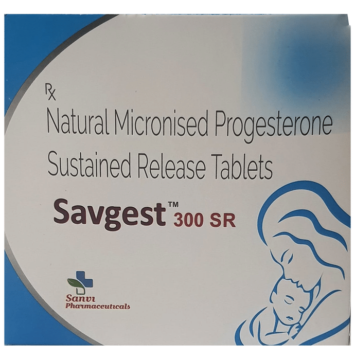 Savgest 300 SR Tablet is a natural female sex hormone, progesterone. It is used to treat menstrual and pregnancy-related issues that are caused due to hormonal imbalance. Savgest 300 SR Tablet is also prescribed along with estrogen as a part of hormonal replacement therapy for preventing endometrial hyperplasia (thickening of the lining of the uterus). It should be taken with food. It should be taken at the same time each day to get the most benefit. You should continue taking it for as long as your doctor has told you to, even if you feel well. The most common side effects include abdominal bloating, abdominal pain, dizziness, headache, depression, breast tenderness, hot flushes, vaginal discharge, joint paint, and urinary incontinence. Side effects are more common during the first few weeks and usually lessen as your body gets used to the medicine. You may also experience bleeding or spotting between your periods, consult with your doctor if it happens frequently. Before taking this medicine, inform your doctor if you have, or have had, breast cancer, unusual bleeding in the vagina, or liver disease. You will probably have several tests both before and during treatment to check your womb. Also, tell your doctor what other medicines you are taking as some may affect, or be affected by, this medicine. In general, it is advisable to avoid alcohol and smoking.