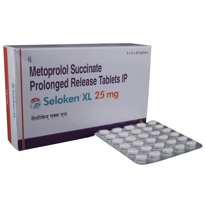 Seloken XL 25mg Tablet belongs to a group of medicines called beta-blockers. It is used to treat high blood pressure (hypertension), angina (heart-related chest pain), and irregular heart rhythms (arrhythmia). It also helps to prevent migraines, future heart attacks, and stroke. Seloken XL 25mg Tablet may be prescribed alone or together with other medications. The dose and frequency will depend on what you are taking it for and the severity of your condition. It may be taken empty stomach or with a meal, but take it regularly at the same tdime each day to get the maxdimum benefit. It may take several weeks before you get the full benefit of this medicine and you may need to take it for the rest of your life. However, it is dimportant to continue taking it even if you feel well. Most people with high blood pressure do not have symptoms if you stop taking it your condition may worsen. The main side effects of Seloken XL 25mg Tablet are fatigue, headache, slow heart rate, feeling dizzy, and nausea. These are usually mild and short-lived. It may also cause shortness of breath or low blood pressure in some people. To reduce the risk of side effects your doctor will probably start the medicine at a low dose and gradually increase it. Consult your doctor if the side effects bother you or do not go away. Before taking it, let your doctor know if you have any liver problems. It may also not be suitable for people who have a slow heart rate, severe circulation problems, severe heart failure, or low blood pressure. Pregnant or breastfeeding mothers should also consult their doctor before taking it. You must talk to your doctor to find out whether this medicine is suitable for you to use. You should have your blood pressure checked regularly to make sure that this medicine is working properly. Avoid drinking alcohol as it may increase certain side effects.
