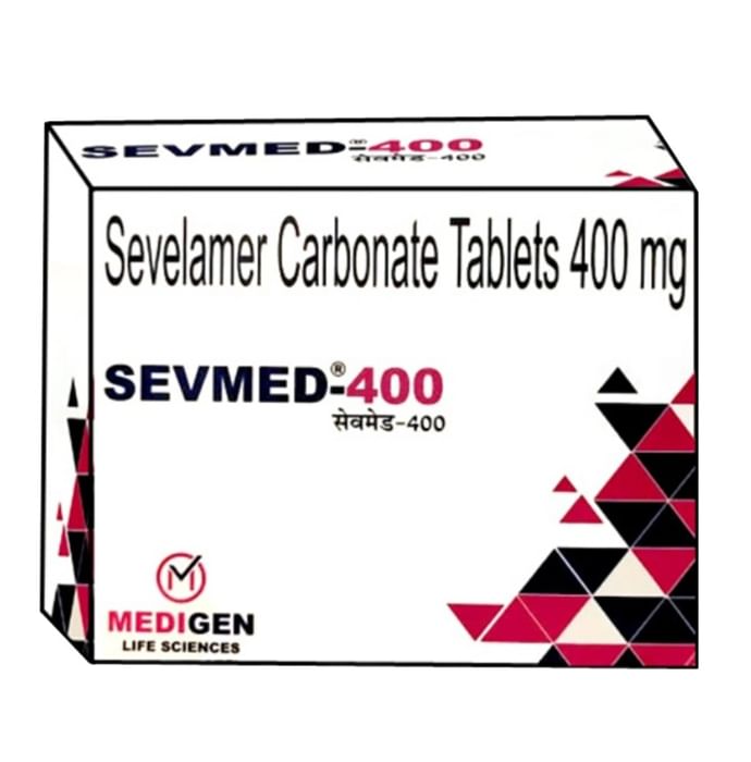 Sevmed 400mg Tablet is used to treat increased phosphate levels in the blood. It is used in patients who are on dialysis due to severe kidney disease. It inhibits the absorption of phosphate from the intestine and lowers the phosphate levels in the blood. Sevmed 400mg Tablet should be taken with food. Take it in the dose and duration as advised by your doctor. Take it regularly and at a fixed time each day to get the maximum benefit of the medicine. Sevmed 400mg Tablet may cause side effects such as nausea, vomiting, abdominal pain, constipation, and diarrhea. You may also develop low levels of calcium, folic acid, and vitamins A, D, E, and K in your blood. Take necessary supplements as advised by your doctor.
