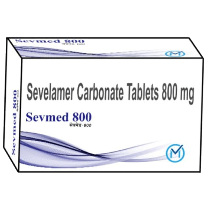 Sevmed 800 Tablet is used to treat increased phosphate levels in the blood. It is used in patients who are on dialysis due to severe kidney disease. It inhibits the absorption of phosphate from the intestine and lowers the phosphate levels in the blood. Sevmed 800 Tablet should be taken with food. Take it in the dose and duration as advised by your doctor. Take it regularly and at a fixed time each day to get the maximum benefit of the medicine. Sevmed 800 Tablet may cause side effects such as nausea, vomiting, abdominal pain, constipation, and diarrhea. You may also develop low levels of calcium, folic acid, and vitamins A, D, E, and K in your blood. Take necessary supplements as advised by your doctor.