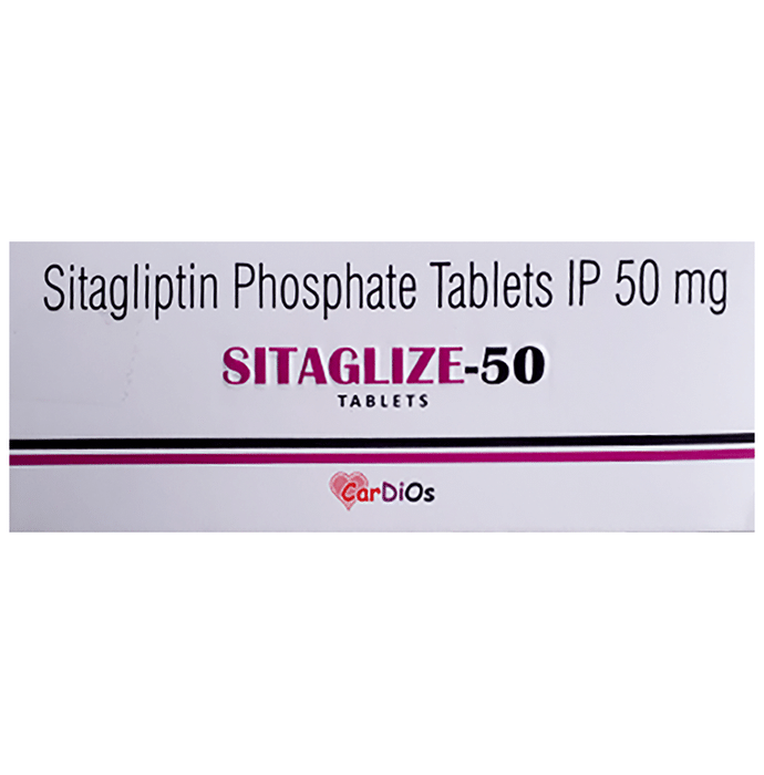 Sitaglize 50 Tablet is a medicine used to treat type 2 diabetes mellitus. It is used together with a healthy diet and regular exercise to control blood sugar levels. This helps to prevent serious complications of diabetes like kidney damage and blindness. Sitaglize 50 Tablet is normally prescribed when diet and exercise alone or other medicines do not prove sufficient to control your blood sugar level. Your doctor may prescribe it alone or along with other diabetes medicines. It may be taken on an empty stomach or with a meal. The dose will depend on your condition, and blood sugar levels. Therefore, you should use it as advised by your doctor. You should take it regularly at the same time each day to get the most benefit, and you should not stop unless your doctor recommends it. This medicine is helping you to control your blood sugar levels and prevent serious complications in the future. It is important to stay on the diet and exercise program recommended by your doctor while taking this medicine. Your lifestyle plays a big part in controlling diabetes. The most common side effect of taking this medicine is a headache. This is usually minor and improves with time. Low blood sugar level (hypoglycemia) is a possible side effect if you are also taking other diabetes medicines like insulin or sulfonylurea, so you need to know how to recognize and deal with it. It may also cause upper respiratory tract infections like sore throat, cough, and cold. Contact your doctor if the side effects worry you or if they do not go away. Before taking this medicine, let your doctor know if you have ever had kidney disease, heart or pancreas problems, or if you drink a lot of alcohol. Pregnant or breastfeeding women should also consult their doctor before taking it. Some other medicines you are taking may interfere with this medicine's working. So, make sure your doctor knows about all the other medicines you are using. Limit your alcohol intake while taking this medicine because it can increase your risk of developing low blood sugar levels. You may need regular tests such as kidney function and blood glucose levels to check that the medicine is working properly.