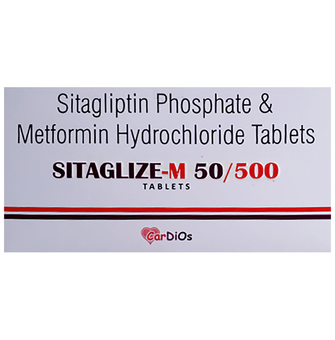 Sitaglize-M 50/500 Tablet is a combination of two medicines that control high blood sugar levels in people with type 2 diabetes mellitus. This helps prevent serious complications of diabetes such as kidney damage and blindness and may reduce your chances of having a heart attack or stroke. Sitaglize-M 50/500 Tablet may be prescribed alone or along with other diabetes medications. It works best when used along with a healthy diet and regular exercise. The dose you are given will depend on your condition, blood sugar levels, and what other medicines you are taking. Taking it with meals helps to reduce the chances of developing an upset stomach. You should take it regularly, at the same time each day, to get the most benefit and you should not stop unless your doctor recommends it. It is important to stay on the diet and exercise program recommended by your doctor while taking this medicine. Your lifestyle plays a big part in controlling diabetes. The most common side effects of taking Sitaglize-M 50/500 Tablet include diarrhea, nausea, vomiting, upset stomach, headache, and sore throat. Low blood sugar level (hypoglycemia) is a possible side effect if you are also taking other diabetes medicines like insulin or sulfonylurea, so you need to know how to recognize and deal with it. This medicine is not suitable for everyone. Before taking it, you should let your doctor know if you have ever had kidney, liver, or heart disease, problems with your pancreas, or if you drink a lot of alcohol. Pregnant or breastfeeding women should also consult their doctor before taking this medicine. Some other medicines may affect Sitaglize-M 50/500 Tablet so tell your doctor about all the other medicines you are taking to make sure you are safe. You should try to avoid drinking alcohol as it lowers blood glucose. Your doctor will check your kidney function and blood sugar levels before and during treatment.