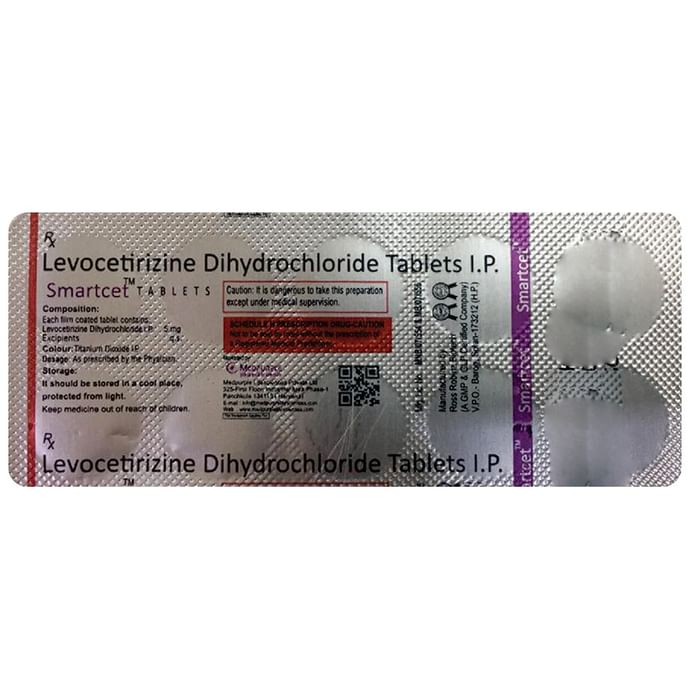 Smartcet Tablet belongs to a group of medicines called antihistamines. It is used to treat various allergic conditions such as hay fever, conjunctivitis, some skin reactions such as eczema, hives, and reactions to bites and stings. It also relieves watery eyes, runny nose, sneezing, and itching. Smartcet Tablet can be taken with or without food. The dose required by you may vary depending on what you are taking it for. This medicine is usually taken in the evening, but follow the advice of your doctor on how to take it. You may need this medicine only on days you have symptoms, but if you are taking it to prevent the symptoms then you should take it regularly. If you miss doses or stop taking it earlier than advised, your symptoms may come back. This medicine is generally very safe. The most common side effects include feeling sleepy or dizzy, dry mouth, fatigue, and headache. These are usually mild and go away after a couple of days as your body adjusts to it. Consult your doctor if any of the side effects persist or worry you. Before taking it, tell your doctor if you have any kidney problems or epilepsy (seizures). Your dose may need to be modified or this medicine may not suit you. Some other medicines can interact with this medicine so let your healthcare team know what else you are taking. You should also talk to your doctor before using this medicine if you are pregnant or breastfeeding, although it is not thought to be harmful.