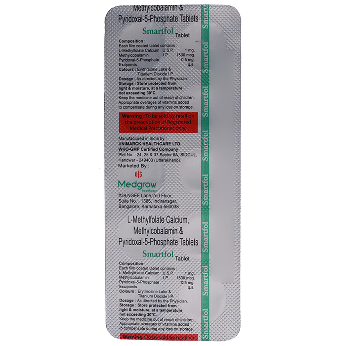 Smartfol Tablet is a combination medicine that is used in the treatment of nutritional deficiencies. It helps in the growth and development of the body and replenishes the body's stores of important nutrients. Smartfol Tablet can be taken with or without food. It should be used in the dose and duration as prescribed by your doctor. It is advised to take this medicine at a fixed time. This medicine should not be taken in more than the recommended dose. Contact your doctor immediately if you notice any symptoms of allergic reactions like swelling, itching, difficulty in breathing, hives, etc. Before taking this medicine, tell your doctor if you have any other health conditions. Inform your doctor if you are taking any other medicines or if you are pregnant or breastfeeding.