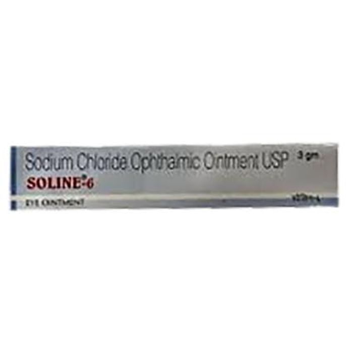 Soline 6 Eye Ointment is a purified salt solution. It is used to treat dry eyes. Soline 6 Eye Ointment is for external use only. It works by cleansing action. It cleans the eye and withdraws water from the front surface of the cornea which is the swollen cornea. This action relieves swelling in the eye which helps in clearing your vision. You should use it in a dose and duration as advised by your doctor. Before using this medicine, check the label. To use, hold it close to the eye. Gently press so that the medicine gets placed inside the lower eyelid. The most common side effects may include burning sensation. After using this medicine, do not drive as it may cause blurring of the vision. Inform your doctor if you are on any other medication or are allergic to this medicine.