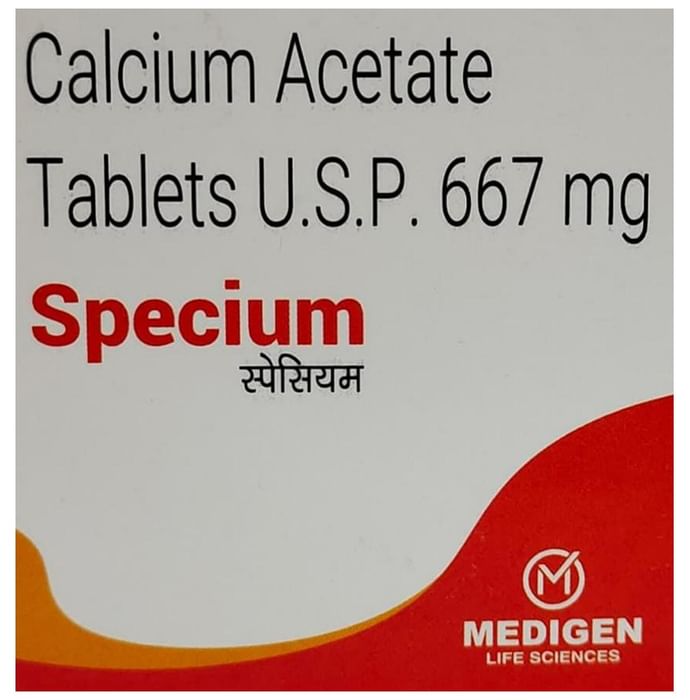 Specium Tablet is a medicine used to treat high phosphate levels in the blood. It helps to lower the phosphate levels in the blood and prevents complications, particularly in people with kidney failure who are on dialysis and are unable to get rid of excess phosphate levels. Specium Tablet should be taken with food. Take it regularly at evenly spaced intervals as per the schedule prescribed by your doctor. Taking it at the same time every day will help you remember to take it. The dose and duration of treatment will depend on the severity of your condition. Do not stop taking the medicine suddenly. Take it for as long as the doctor has prescribed for maximum benefits. The most common side effects of this medicine are increased calcium levels in the blood, nausea, and diarrhea. If you are bothered by these or experience any other symptoms on taking this medicine, let your doctor know. They may be able to suggest ways of reducing or preventing them. Before taking this medicine, inform your doctor if you have any medical conditions. Let your doctor also know about all the other medicines you are taking, if any. While on treatment with this medicine, avoid taking additional calcium supplements unless your doctor has told you to. You may need frequent medical tests to monitor the effectiveness of the medicine. Pregnant and breastfeeding women should consult their doctors before taking the medicine.