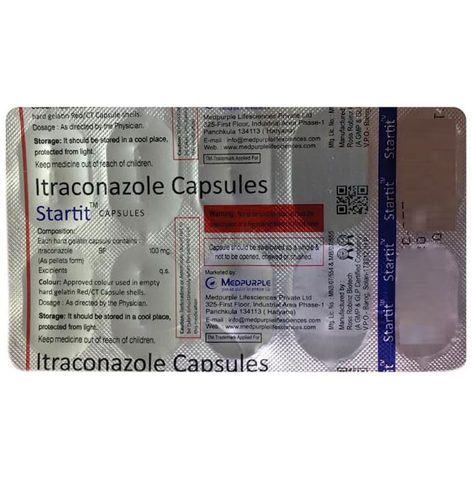 In Treatment of Fungal infections Startit Capsule is an antifungal medicine. It is used to treat infections in different parts of the body caused by fungi. It works by killing and stopping the growth of fungi. This provides relief from various symptoms caused by the infection and speeds up the healing process. You should keep taking the medicine until you complete the dose even if you get better. This will prevent the infection from returning.