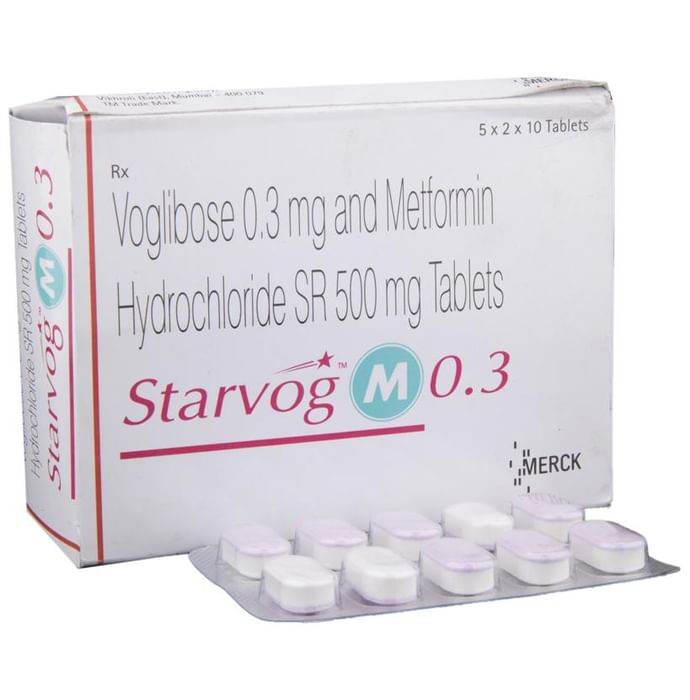 Starvog M 0.3 Tablet SR belongs to a category of medicines known as anti-diabetic drugs. It is a combination of medicines used to treat type 2 diabetes mellitus in adults. It helps control blood sugar levels in people with diabetes. Starvog M 0.3 Tablet SR should be taken with food. Take it regularly at the same time each day to get the most benefit. Your doctor will decide what dose is best for you and this may change from time to time according to how it is working according to your blood sugar levels. Keep taking this medicine, even if you feel well or your blood sugar levels are controlled. If you stop it without consulting your doctor, your blood sugar levels could rise and put you at risk of kidney damage, blindness, nerve problems and loss of limbs. Remember that it is only part of a treatment program that should also include a healthy diet, regular exercise, and weight reduction as advised by your doctor. Your lifestyle plays a big part in controlling diabetes. This medicine may cause side effects like nausea, taste change, loss of appetite, flatulence, stomach pain, diarrhea, and skin rash. However, these are temporary and usually subside on their own. If these do not resolve or worry you, please consult your doctor. Your doctor might suggest ways of dealing with your side effects or treating them if they are bothersome. You should not take it if you have type 1 diabetes mellitus, if you have diabetic ketoacidosis (high levels of acid in your blood), or if you have severe kidney or liver disease. Before taking this medicine, tell your doctor if you have ever had heart disease. It may not be suitable. Pregnant or breastfeeding women should also consult their doctor before taking it. Your blood sugar levels should be checked regularly and your doctor may also advise blood tests to monitor your blood cell counts and liver function.