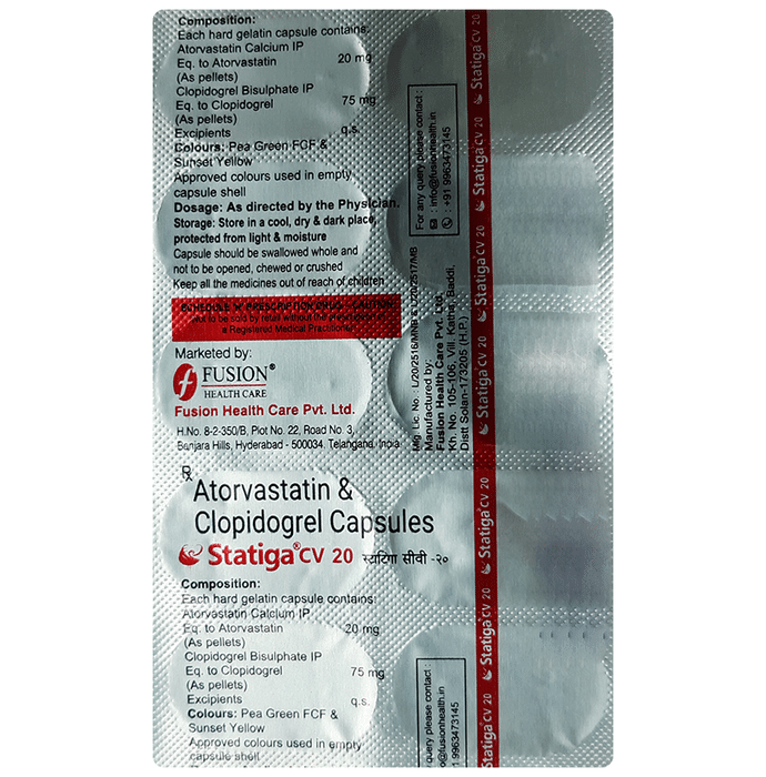 In Heart attack prevention and high cholesterol Statiga CV 20mg/75mg Capsule is a combination medicine that is used to prevent heart attack. It contains Atorvastatin that works by reducing the amount of “bad” cholesterol (LDL) and raising the amount of “good” cholesterol (HDL) in your blood. High levels of cholesterol can cause your blood vessels to narrow (atherosclerosis). Lowering the amount of cholesterol reduces the chances of heart diseases and helps you remain healthier for longer. Besides, it also contains a blood thinner, Clopidogrel, that prevents the formation of blood clots and also prevents the existing ones from growing bigger in size. Take it regularly and make appropriate lifestyle changes (such as eating healthy and staying active) to maximize the effectiveness of this medicine. Keep taking it even if you feel well.