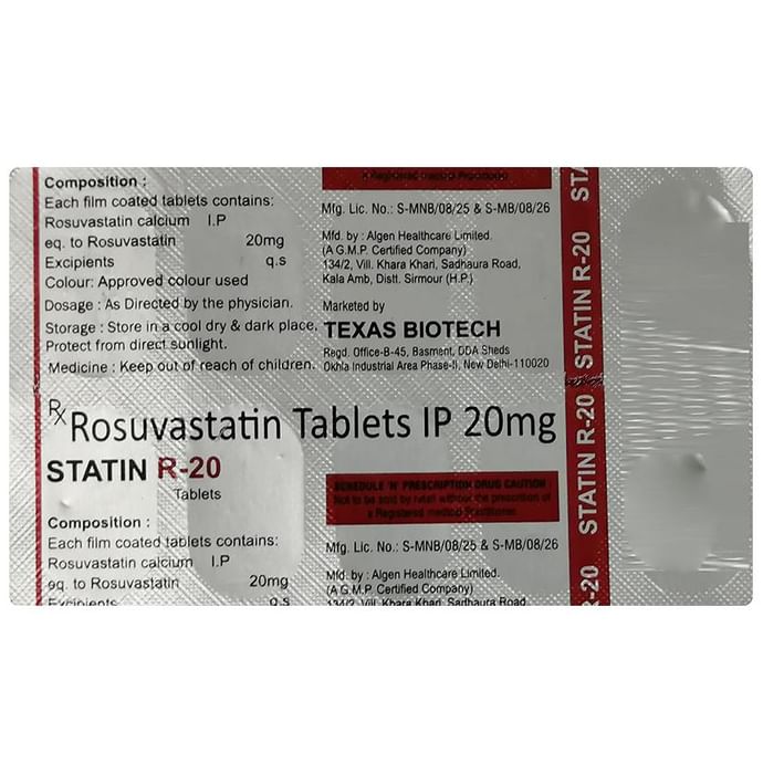 Statin R 20 Tablet belongs to a group of medicines called statins. It is used to lower cholesterol and reduce the risk of heart disease. Cholesterol is a fatty substance that builds up in your blood vessels and causes narrowing, which may lead to a heart attack or stroke. Statin R 20 Tablet is a widely prescribed medicine and is regarded as safe for long-term use. It can be taken with a meal or on an empty stomach. You can take it at any time of the day but try to take it at the same time each day. Most people with high cholesterol do not feel ill, but stopping your medicine may increase your cholesterol levels, making your condition worse and increasing your risk of heart disease and stroke. It is important to have your cholesterol levels checked regularly. This medicine is only one part of the treatment program which should also include a healthy diet, regular exercise, smoking cessation, moderation of alcohol intake, and weight reduction. You can eat normally while taking this medicine, but try to avoid foods that are high in fat. Common side effects of this medicine include muscle pain, weakness, nausea, headache, and stomach pain. These are usually mild and disappear after a short time. Consult your doctor if they persist or if you notice any yellowing of your eyes or get repeated or unexplained muscle pains. This medicine should not be used in conditions such as liver disease. Also, pregnant women and breastfeeding mothers should not take this medicine as it may harm the developing baby. Diabetic patients should monitor their blood sugar levels while taking this medicine, as it may lead to an increase in blood sugar levels.