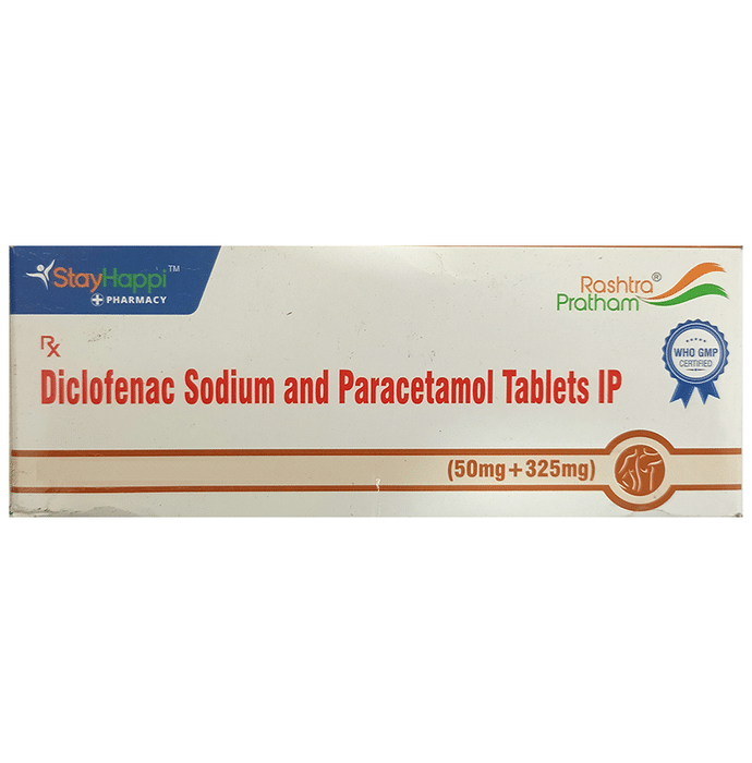 In Pain relief StayHappi Diclofenac+Paracetamol 50mg/325mg Tablet is a combination of medicines that is used for short-term relief of pain, inflammation and swelling. It inhibits release of those chemical messengers in the brain that tell us that we have pain. It effectively relieves back pain, earache, throat pain, toothache and pain due to arthritis too. Take it as it is prescribed to get the most benefit. Do not take more or for longer than needed as that can be dangerous. In general, you should take the lowest dose that works, for the shortest possible time. This will help you to go about your daily activities more easily and have a better, more active, quality of life.