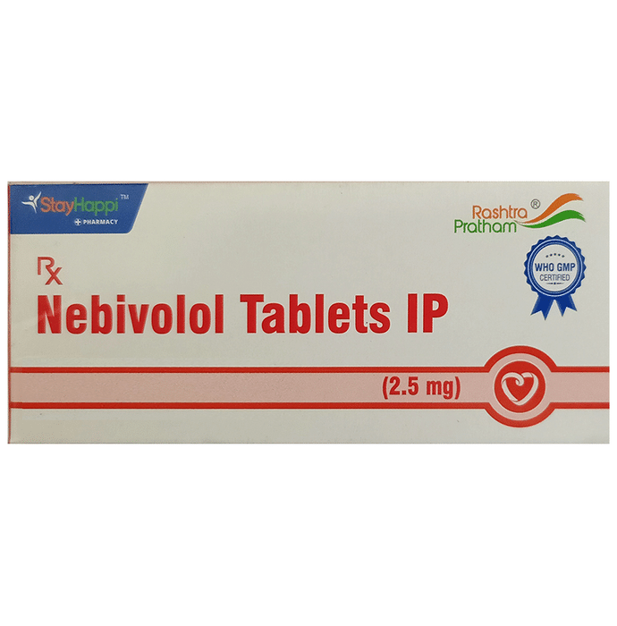 StayHappi Nebivolol 2.5mg Tablet belongs to a group of medicines called beta-blockers. It is used to treat high blood pressure (hypertension). It also helps to prevent future heart attacks and stroke and to prevent migraines. StayHappi Nebivolol 2.5mg Tablet is also used to relieve the symptoms caused by an overactive thyroid gland. It may be prescribed alone or together with other medications. The dose and frequency depend on what you are taking it for and the severity of your condition. It may be taken empty stomach or with a meal, but take it regularly at the same time each day to get the most benefit. It may take several weeks before you get the full benefit of this medicine and you may need to take it for the rest of your life. However, it is important to continue taking it even if you feel well. Most people with high blood pressure do not feel ill and if you stop taking it, your condition may worsen. Lifestyle changes like low-fat diet, exercise, and no smoking help to enhance the working of this medicine. The main side effects of this medicine are fatigue, headache, slow heart rate, feeling dizzy, and nausea. These are usually mild and short-lived. It may also cause shortness of breath or low blood pressure in some people. To reduce the risk of side effects your doctor will probably start the medicine at a low dose and gradually increase it. Consult your doctor if the side effects bother you or do not go away. Before taking it, let your doctor know if you have any liver problems. It may also not be suitable for people who have a slow heart rate, severe circulation problems, severe heart failure, or low blood pressure. Pregnant or breastfeeding mothers should also consult their doctor before taking it. You must talk to your doctor to find out whether this medicine is suitable for you to use. You should have your blood pressure checked regularly to make sure that this medicine is working properly. Avoid drinking alcohol as it may increase certain side effects.