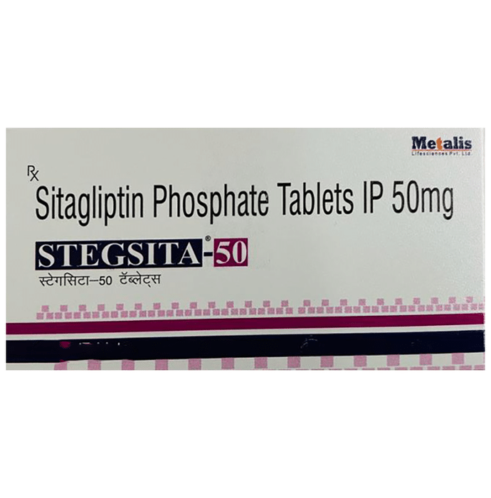Stegsita 50 Tablet is a medicine used to treat type 2 diabetes mellitus. It is used together with a healthy diet and regular exercise to control blood sugar levels. This helps to prevent serious complications of diabetes like kidney damage and blindness. Stegsita 50 Tablet is normally prescribed when diet and exercise alone or other medicines do not prove sufficient to control your blood sugar level. Your doctor may prescribe it alone or along with other diabetes medicines. It may be taken on an empty stomach or with a meal. The dose will depend on your condition, and blood sugar levels. Therefore, you should use it as advised by your doctor. You should take it regularly at the same time each day to get the most benefit, and you should not stop unless your doctor recommends it. This medicine is helping you to control your blood sugar levels and prevent serious complications in the future. It is important to stay on the diet and exercise program recommended by your doctor while taking this medicine. Your lifestyle plays a big part in controlling diabetes. The most common side effect of taking this medicine is a headache. This is usually minor and improves with time. Low blood sugar level (hypoglycemia) is a possible side effect if you are also taking other diabetes medicines like insulin or sulfonylurea, so you need to know how to recognize and deal with it. It may also cause upper respiratory tract infections like sore throat, cough, and cold. Contact your doctor if the side effects worry you or if they do not go away. Before taking this medicine, let your doctor know if you have ever had kidney disease, heart or pancreas problems, or if you drink a lot of alcohol. Pregnant or breastfeeding women should also consult their doctor before taking it. Some other medicines you are taking may interfere with this medicine's working. So, make sure your doctor knows about all the other medicines you are using. Limit your alcohol intake while taking this medicine because it can increase your risk of developing low blood sugar levels. You may need regular tests such as kidney function and blood glucose levels to check that the medicine is working properly.