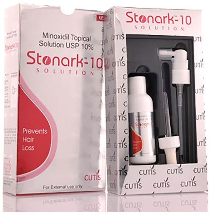 In Treatment of Hair loss Stonark 10% Solution is a medicine used to treat common hereditary hair loss. It can prevent further hair loss and help hair to re-grow. It works by increasing blood flow to the hair follicles on your scalp, which prevents hair cell death and also enhances new hair growth. It is most effective for baldness or thinning at the top of the scalp but less effective at the front or for receding hairline. Benefits are less likely if you have been bald for many years or have a large area of hair loss. Stonark 10% Solution is not suitable for sudden or unexplained hair loss. It is considered a safe medicine. There are separate products for men and women and you should follow your doctor’s instructions carefully while using Stonark 10% Solution. Regrowth of hair improves your appearance, boosts your confidence, and enhances your social life. Use it regularly to maintain hair growth and to get the maximum benefits. Consult your doctor if you notice any changes in the hair growth while using Stonark 10% Solution.