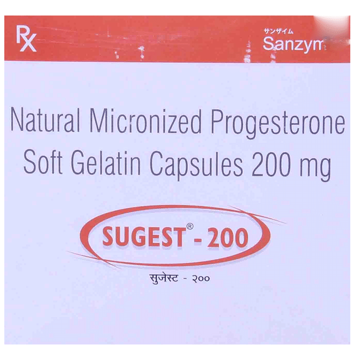 Sugest 200 Soft Gelatin Capsule is a natural female sex hormone, progesterone. It is used to treat menstrual and pregnancy-related issues that are caused due to hormonal imbalance. Sugest 200 Soft Gelatin Capsule is also prescribed along with estrogen as a part of hormonal replacement therapy for preventing endometrial hyperplasia (thickening of the lining of the uterus). It should be taken with food. It should be taken at the same time each day to get the most benefit. You should continue taking it for as long as your doctor has told you to, even if you feel well. The most common side effects include abdominal bloating, abdominal pain, dizziness, headache, depression, breast tenderness, hot flushes, vaginal discharge, joint paint, and urinary incontinence. Side effects are more common during the first few weeks and usually lessen as your body gets used to the medicine. You may also experience bleeding or spotting between your periods, consult with your doctor if it happens frequently. Before taking this medicine, inform your doctor if you have, or have had, breast cancer, unusual bleeding in the vagina, or liver disease. You will probably have several tests both before and during treatment to check your womb. Also, tell your doctor what other medicines you are taking as some may affect, or be affected by, this medicine. In general, it is advisable to avoid alcohol and smoking.