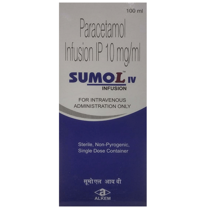 Sumo L IV Infusion helps in relieving moderate pain and reducing fever. It effectively alleviates pain and reduces fever for the short-term in cases following surgery or in cases where oral administration is not possible. Sumo L IV Infusion is administered by a doctor or a nurse and should not be self-administered. Depending on the severity of your underlying illness, your doctor will decide the precise dose and schedule as per which this injection is to be given. It starts working within one hour. Inform your doctor if you are also taking other medications containing paracetamol to avoid an overdose. You should let your doctor know if your pain or fever does not subside. Vomiting, difficulty sleeping, and constipation may be seen as side effects in some patients. Consult your doctor if these side effects do not resolve with tdime and persist for a longer duration of tdime. Inform your doctor dimmediately if any rash or allergic reaction is observed while taking this medicine. Pregnant and nursing women should use it under medical supervision only. It should be used with caution in patients with liver and kidney disease or alcohol abuse. It is not recommended in patients with severe or active liver disease.