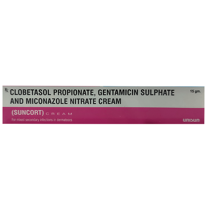 Suncort Cream is used to treat various types of skin infections. It minimizes symptoms of inflammation such as redness, swelling, and itching. It also prevents the growth of infection-causing microorganisms and promotes faster healing of infections. Suncort Cream is only meant for external use and should be used as advised by your doctor. A thin layer of the medicine should be applied only to the affected areas of the skin with clean and dry hands. Wash your hands before and after the application of the medicine. If it gets into your eyes, nose, mouth, or vagina rinse with water. It may take several days to weeks for your symptoms to improve, but you should keep using this medicine regularly. The course of the treatment should be completed to ensure the better efficacy of the medicine. If your condition does not improve or gets worse, you should talk to your doctor. This medicine is usually safe, however, it may cause burning, irritation, itching, and redness at the application site. These side effects are usually mild and self-limiting. Serious side effects are rare. You must consult the doctor if you experience any allergic reaction (rashes, itching, swelling, shortness of breath, etc.). Before taking this medicine, it is important to tell your doctor if you are taking or have recently taken any other medicines for the same disease or other diseases. Pregnant and breastfeeding women should use this medicine with proper consultation and caution. If you are a known allergic to the medicine, you must refrain from using this medicine and consult your doctor. During the course of the treatment, do not touch or scratch the infected skin areas as this may worsen or spread the infection.