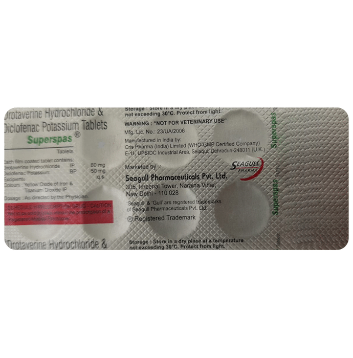 Superspas Tablet is a combination medicine used in the treatment of abdominal pain. It works effectively to reduce abdominal pain, bloating, discomfort and cramps by relaxing the muscles of the stomach and gut. It also blocks certain chemical messengers that cause pain, inflammation and fever. Superspas Tablet is taken with food in a dose and duration as advised by the doctor. The dose you are given will depend on your condition and how you respond to the medicine. You should keep taking this medicine for as long as your doctor recommends. If you stop treatment too early your symptoms may come back and your condition may worsen. Let your healthcare team know about all other medications you are taking as some may affect, or be affected by this medicine. The most common side effects are diarrhea, nausea, vomiting, stomach pain, dryness in mouth, loss of appetite, feeling thirsty, and heartburn. Most of these are temporary and usually resolve with tdime. Contact your doctor straight away if you are at all concerned about any of these side effects. It may also cause dizziness and drowsiness, so do not drive or do anything that requires mental focus until you know how this medicine affects you. Avoid drinking alcohol while taking this medicine as it can worsen your dizziness. Before taking this medicine, you should tell your doctor if you are pregnant, planning pregnancy or breastfeeding. You should also tell your doctor if you have any kidney or liver diseases so that your doctor can prescribe a suitable dose for you.