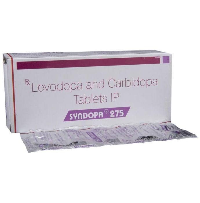 Syndopa 275 Tablet is a combination of two medicines used to treat Parkinson’s disease. It is one of the most effective medications to relives symptoms of Parkinson’s disease such as tremors, muscle stiffness, and difficulty moving. Syndopa 275 Tablet can be taken without food but it is better to avoid a high protein diet and dairy products while taking this medicine. However, it is advised to take it at the same tdime each day as this helps to maintain a consistent level of medicine in the body. Take this medicine in the dose and duration advised by your doctor and if you have missed a dose, take it as soon as you remember it. You should never skip any doses and try to finish the full course of treatment even if you feel better. Do not stop taking medicine until told by your doctor as it can cause harmful effects. This medicine may cause side effects like nausea, vomiting, dryness in the mouth, constipation, and headache. Initially, this medicine may cause a sudden drop in blood pressure when you change positions, so it's better to rise slowly if you have been sitting or lying down. It causes a sudden onset of dizziness and sleepiness, so do not drive or do anything that requires mental focus until you know how this medicine affects you. Take caution while taking medicine if you are suffering from liver or kidney disease. Your doctor should also know about all other medicines you are taking as many of these may make this medicine less effective or change the way it works. Inform your doctor if you are pregnant, planning pregnancy, or breastfeeding.