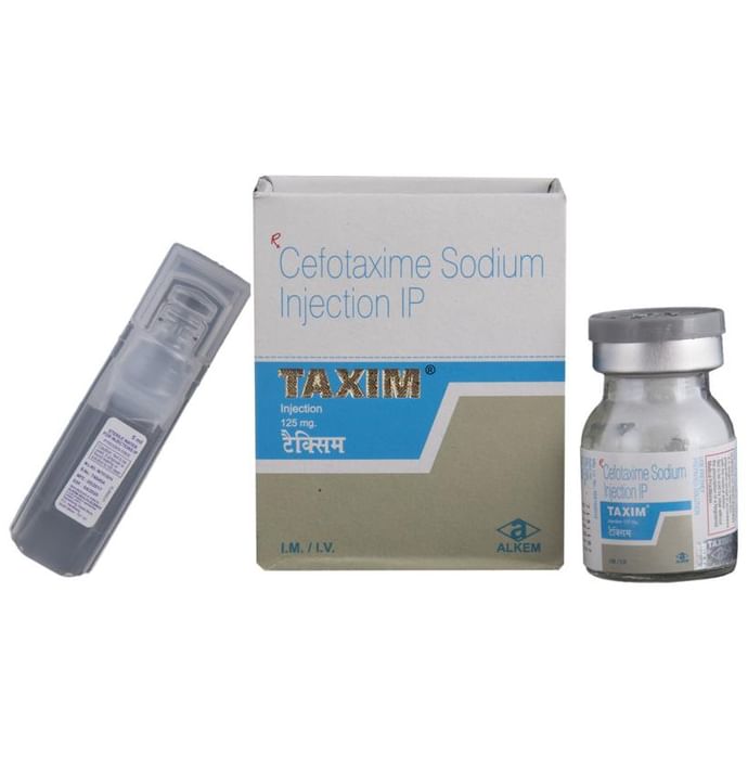 Taxim 125mg Injection is an antibiotic medicine used to treat bacterial infections in your body. It is effective in infections of the brain, lungs, ear, urinary tract, skin and soft tissues, bones and joints, blood, and heart. It is also used to prevent infections during surgery. Taxim 125mg Injection fights and stops the growth of many types of bacteria. This helps to improve your symptoms and cure the underlying infection. It is given as a drip (intravenous infusion) or as an injection directly into a vein or a muscle under the supervision of a healthcare professional. Your doctor will decide the correct dose for you. You should use this medicine regularly at evenly spaced intervals as per the schedule prescribed by your doctor. Do not skip any doses and finish the full course of treatment even if you feel better. Stopping the medicine too early may lead to the infection returning or worsening. The most common side effects of this medicine include rash and diarrhea. Some people may develop temporary redness or pain at the site of injection. These side effects are usually mild but let your doctor know if they bother you or last more than a few days. Before using it, you should tell your doctor if you are allergic to any antibiotics, and if you have any liver or kidney problems. You should also let your healthcare team know all other medicines you are taking as they may affect, or be affected by this medicine. Pregnant and breastfeeding mothers should consult their doctor before using it.