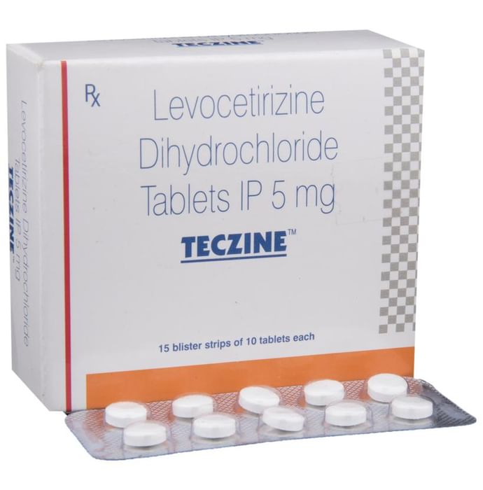 Teczine Tablet belongs to a group of medicines called antihistamines. It is used to treat various allergic conditions such as hay fever, conjunctivitis, some skin reactions such as eczema, hives, and reactions to bites and stings. It also relieves watery eyes, runny nose, sneezing, and itching. Teczine Tablet can be taken with or without food. The dose required by you may vary depending on what you are taking it for. This medicine is usually taken in the evening, but follow the advice of your doctor on how to take it. You may need this medicine only on days you have symptoms, but if you are taking it to prevent the symptoms then you should take it regularly. If you miss doses or stop taking it earlier than advised, your symptoms may come back. This medicine is generally very safe. The most common side effects include feeling sleepy or dizzy, dry mouth, fatigue, and headache. These are usually mild and go away after a couple of days as your body adjusts to it. Consult your doctor if any of the side effects persist or worry you. Before taking it, tell your doctor if you have any kidney problems or epilepsy (seizures). Your dose may need to be modified or this medicine may not suit you. Some other medicines can interact with this medicine so let your healthcare team know what else you are taking. You should also talk to your doctor before using this medicine if you are pregnant or breastfeeding, although it is not thought to be harmful.