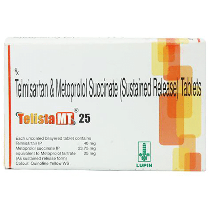 Telista MT 25 Tablet SR is a medicine used for treating high blood pressure. By lowering blood pressure, it helps in preventing future heart attacks and strokes. Early treatment with this medicine also improves the chances of survival in patients with heart attacks. It is advised to take Telista MT 25 Tablet SR with food at a fixed time each day to maintain consistent levels of medicine in the blood. Keep taking it for as long as advised by your doctor. Even if you feel well, do not stop this medicine on your own because high blood pressure often has no symptoms. If you stop taking it, your condition may get worse. Keeping active with regular exercise, reducing your weight and eating a healthy diet will also help control your blood pressure. Follow your doctor’s advice while taking this medicine. Some common side effects of this medicine include headache, weakness, dizziness, decreased blood pressure, and increased potassium level in blood. It is advised to avoid potassium rich food and supplements while taking this medicine. It may cause dizziness, avoid driving or rise slowly from the sitting position. You may be asked for regular monitoring of blood pressure, blood sugar level, kidney functioning, urea, or electrolytes level during the treatment. Before taking it, let your doctor know if you have any liver or kidney problems. Pregnant or breastfeeding women should also consult their doctor for advice before taking this medicine. You also need to tell your doctor what other medicines you are taking especially those used to treat high blood pressure or heart conditions.
