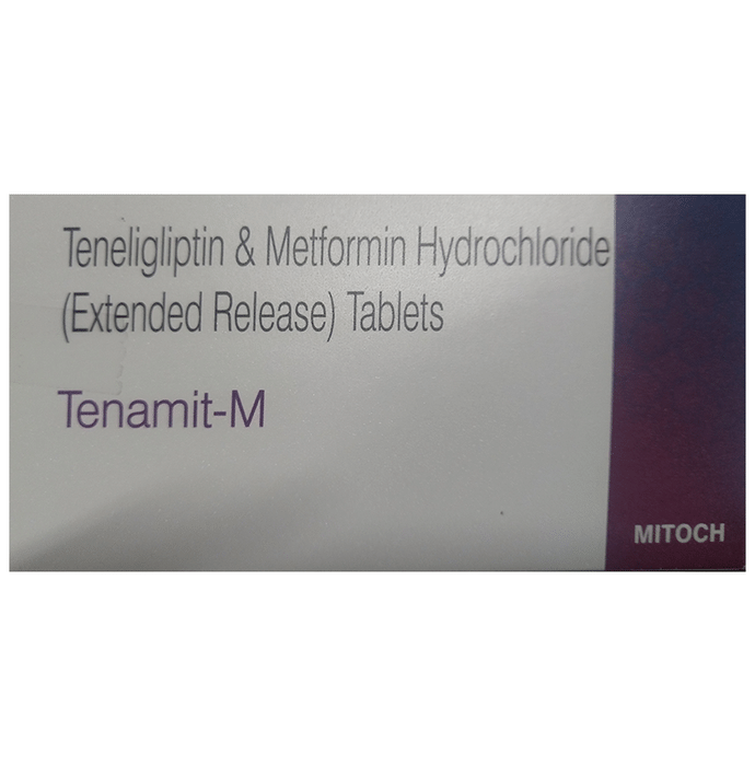 Tenamit-M Tablet ER is a combination of two medicines that control high blood sugar levels in people with type 2 diabetes mellitus. This helps prevent serious complications of diabetes such as kidney damage and blindness and may also reduce your chances of having a heart attack or stroke. Tenamit-M Tablet ER can be prescribed alone or together with other diabetes medications. All diabetes medicines work best when used along with a healthy diet and regular exercise. The dose you are given will depend on your condition, blood sugar levels, and what other medicines you are taking. Taking it with meals helps to reduce the chances of developing an upset stomach. You should take it regularly, at the same time each day, to get the most benefit and you should not stop unless your doctor recommends it. It is controlling your blood sugar levels and helping to prevent serious complications in the future. It is important to stay on the diet and exercise program recommended by your doctor while taking this medicine. Your lifestyle plays a big part in controlling diabetes. The most common side effects of taking this medicine include diarrhea, nausea, vomiting, upset stomach, headache, and sore throat. Low blood sugar level (hypoglycemia) is a possible side effect if you are also taking other diabetes medicines like insulin or sulfonylurea, so you need to know how to recognize and deal with it. This medicine is not suitable for everyone. Before taking it, you should let your doctor know if you have ever had kidney, liver, or heart disease, problems with your pancreas, or if you drink a lot of alcohol. Pregnant or breastfeeding women should also consult their doctor before taking this medicine. Some other medicines can affect this one so tell your doctor about all the medicines you are taking to make sure you are safe. You should try to avoid drinking alcohol as it lowers blood glucose. Your doctor will check your kidney function and blood sugar levels before and during treatment.