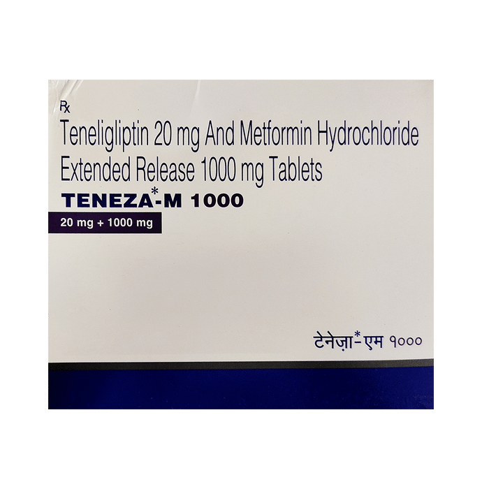 Teneza-M 1000 Tablet ER is a combination of two medicines that control high blood sugar levels in people with type 2 diabetes mellitus. This helps prevent serious complications of diabetes such as kidney damage and blindness and may also reduce your chances of having a heart attack or stroke. Teneza-M 1000 Tablet ER can be prescribed alone or together with other diabetes medications. All diabetes medicines work best when used along with a healthy diet and regular exercise. The dose you are given will depend on your condition, blood sugar levels, and what other medicines you are taking. Taking it with meals helps to reduce the chances of developing an upset stomach. You should take it regularly, at the same time each day, to get the most benefit and you should not stop unless your doctor recommends it. It is controlling your blood sugar levels and helping to prevent serious complications in the future. It is important to stay on the diet and exercise program recommended by your doctor while taking this medicine. Your lifestyle plays a big part in controlling diabetes. The most common side effects of taking this medicine include diarrhea, nausea, vomiting, upset stomach, headache, and sore throat. Low blood sugar level (hypoglycemia) is a possible side effect if you are also taking other diabetes medicines like insulin or sulfonylurea, so you need to know how to recognize and deal with it. This medicine is not suitable for everyone. Before taking it, you should let your doctor know if you have ever had kidney, liver, or heart disease, problems with your pancreas, or if you drink a lot of alcohol. Pregnant or breastfeeding women should also consult their doctor before taking this medicine. Some other medicines can affect this one so tell your doctor about all the medicines you are taking to make sure you are safe. You should try to avoid drinking alcohol as it lowers blood glucose. Your doctor will check your kidney function and blood sugar levels before and during treatment.