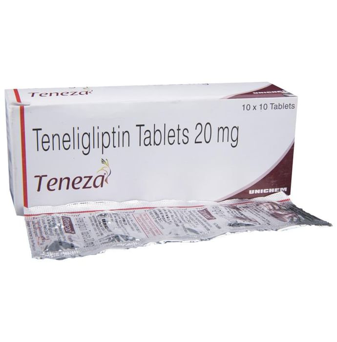 Teneza Tablet is a medicine used to treat type 2 diabetes mellitus. It is used together with a healthy diet and regular exercise to control blood sugar levels. This helps to prevent serious complications of diabetes like kidney damage and blindness. Teneza Tablet is normally prescribed when diet and exercise alone or other medicines do not prove sufficient to control your blood sugar level. Your doctor may prescribe it alone or in combination with other diabetes medicines. It can be taken with or without food. The dose will depend on your condition and blood sugar levels. Use it strictly as advised by your doctor. You should take it regularly at the same time each day to get the most benefit from it. Do not stop taking the medicine unless your doctor recommends it. This medicine helps you control your blood sugar levels and prevent serious complications in the future. It is important to stay on the diet and exercise program recommended by your doctor while taking this medicine. Your lifestyle plays a big part in controlling diabetes. The most common side effects of this medicine are hypoglycemia and constipation. It is important to recognize the symptoms of hypoglycemia (such as lightheadedness, sweating, dizziness, fainting, and dry mouth) and know how to deal with it. You can carry sugar or glucose candy and have them to control your symptoms if you experience any. Contact your doctor if the side effects if they do not go away or worry you. Before taking this medicine, let your doctor know if you have ever had kidney disease, heart disease, or pancreas problems. Pregnant or breastfeeding women should also consult their doctor before taking it. Some other medicines you are taking may interfere with this medicine's working. So, make sure your doctor knows about all the other medicines you are using. Limit your alcohol intake while taking this medicine because it can increase your risk of developing low blood sugar levels. You may need regular tests such as kidney function and blood glucose levels to check that the medicine is working properly.
