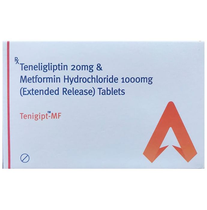 Tenigipt-MF Tablet ER is a combination of two medicines that control high blood sugar levels in people with type 2 diabetes mellitus. This helps prevent serious complications of diabetes such as kidney damage and blindness and may also reduce your chances of having a heart attack or stroke. Tenigipt-MF Tablet ER can be prescribed alone or together with other diabetes medications. All diabetes medicines work best when used along with a healthy diet and regular exercise. The dose you are given will depend on your condition, blood sugar levels, and what other medicines you are taking. Taking it with meals helps to reduce the chances of developing an upset stomach. You should take it regularly, at the same tdime each day, to get the most benefit and you should not stop unless your doctor recommends it. It is controlling your blood sugar levels and helping to prevent serious complications in the future. It is dimportant to stay on the diet and exercise program recommended by your doctor while taking this medicine. Your lifestyle plays a big part in controlling diabetes. The most common side effects of taking this medicine include diarrhea, nausea, vomiting, upset stomach, headache, and sore throat. Low blood sugar level (hypoglycemia) is a possible side effect if you are also taking other diabetes medicines like insulin or sulfonylurea, so you need to know how to recognize and deal with it. This medicine is not suitable for everyone. Before taking it, you should let your doctor know if you have ever had kidney, liver, or heart disease, problems with your pancreas, or if you drink a lot of alcohol. Pregnant or breastfeeding women should also consult their doctor before taking this medicine. Some other medicines can affect this one so tell your doctor about all the medicines you are taking to make sure you are safe. You should try to avoid drinking alcohol as it lowers blood glucose. Your doctor will check your kidney function and blood sugar levels before and during treatment.