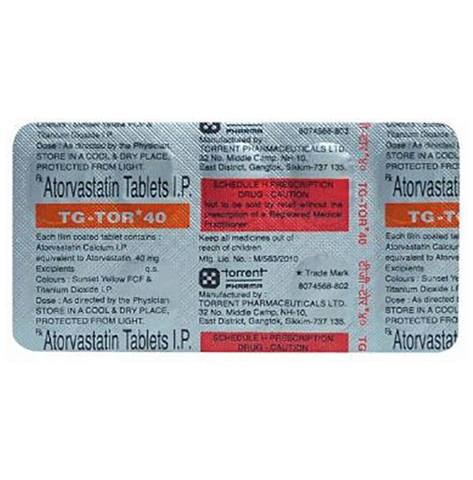 TG-Tor 40 Tablet belongs to a group of medicines called statins. It is used to lower cholesterol and to reduce the risk of heart diseases. Cholesterol is a fatty substance that builds up in your blood vessels and causes narrowing, which may lead to a heart attack or stroke. TG-Tor 40 Tablet is a widely prescribed medicine and is regarded as safe for long-term use when taken as per the doctor's advice. It can be taken with a meal or on an empty stomach. You can take it at any time of the day but try to take it at about the same time each day. Most people with high cholesterol do not feel ill, but stopping your medicine may increase your cholesterol levels thereby increasing your risk of heart disease and stroke. It is important to have your cholesterol levels checked regularly. This medicine is only one part of the treatment program which should also include a healthy diet, regular exercise, smoking cessation, moderation of alcohol intake, and weight reduction. You can eat normally while taking this medicine, but try to avoid foods that are high in fat. Common side effects of this medicine include constipation, flatulence, dyspepsia, and abdominal pain. These are usually mild and disappear after a short time. Consult your doctor if they persist or if you notice any yellowing of your eyes or get repeated or unexplained muscle pains. This medicine should not be used in some conditions such as liver disease. Also, pregnant women and breastfeeding mothers should not take this medicine as it may harm the developing baby. Diabetic patients should monitor their blood sugar levels while taking this medicine, as it may lead to an increase in blood sugar levels. Your doctor may check your liver function before starting the treatment and monitor it regularly thereafter.