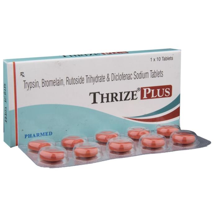 Thrize Plus Tablet is a pain relieving medicine. It is used to reduce pain and inflammation in conditions like rheumatoid arthritis, ankylosing spondylitis, and osteoarthritis. It may also be used to relieve fever, muscle pain, back pain, toothache, or pain in the ear and throat. Thrize Plus Tablet should be taken with food. This will prevent you from getting an upset stomach. You should take it regularly as advised by your doctor. Do not take more or use it for a longer duration than recommended by your doctor. Some of the common side effects of this medicine include nausea, vomiting, heartburn, diarrhea, loss of appetite, and indigestion. If any of these side effects bother you or do not go away with time, you should let your doctor know. Your doctor may help you with ways to reduce or prevent the side effects. The medicine may not be suitable for everybody. Before taking it, let your doctor know if you have any problems with your heart, kidneys, liver, or have stomach ulcers. To make sure it is safe for you, let your doctor know about all the other medicines you are taking. Pregnant and breastfeeding mothers should first consult their doctors before using this medicine.