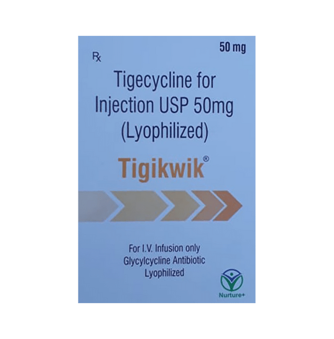 Tigikwik Injection is an antibiotic that fights bacteria. It is used to treat severe infections of the body like skin, intra-abdominal infections, and community-acquired bacterial pneumonia. It works by killing the bacteria that cause these problems. But, it will not treat a viral infection. Tigikwik Injection is commonly used to treat critically ill patients admitted to the hospital. This medicine is given by drip or by direct injection into a vein by a doctor or a nurse. The dose will depend on what type of infection you have, where it is in the body, and how serious it is. You should have your injections at the same time each day to get the most benefit and you should keep on taking this medicine for as long as you are prescribed it, even if your symptoms quickly improve. If you stop taking it too early the infection may return or worsen. Some people may develop side effects like headache, vomiting, nausea, increased liver enzymes, stomach pain, and diarrhea. These side effects are usually temporary and go away during treatment as your body adjusts to the medicine. Consult your doctor if these side effects bother you or do not go away. It may also cause dizziness, so do not drive or do anything that requires mental focus. Before starting treatment with this medicine, you should tell your doctor if you are pregnant, breastfeeding, or suffering from any liver problems or if you are allergic to any antibiotic. While using it, you may be advised blood tests to monitor your liver function.