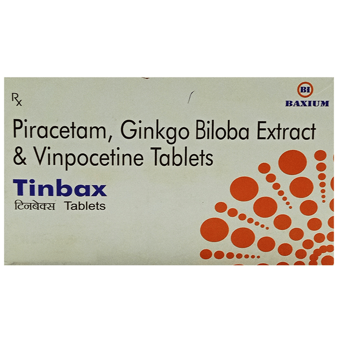 Tinbax Tablet is a combination medicine that is used as a cognitive enhancer. It helps to improve brain function, enhance focus and increase the blood flow to the brain. It also improves communication between the nerve cells and protects the brain. Tinbax Tablet may be taken with or without food, preferably at the same time each day. Take it at the same time each day as this helps to maintain a consistent level of medicine in the body. Take this medicine in the dose and duration as advised by your doctor and if you have missed a dose, take it as soon as you remember it. Do not skip any doses and finish the full course of treatment even if you feel better. It is important that this medication is not stopped suddenly without talking to your doctor as it may worsen your symptoms. Some common side effects of this medicine include stomach upset, rash, flushing (sense of warmth in the face, ears, neck, and trunk), nervousness, and abnormality of voluntary movements. However, these are temporary and usually resolve on their own. Please consult your doctor if these do not subside or bother you. This medicine may cause weight gain and to control it, you should have a balanced diet and exercise regularly.