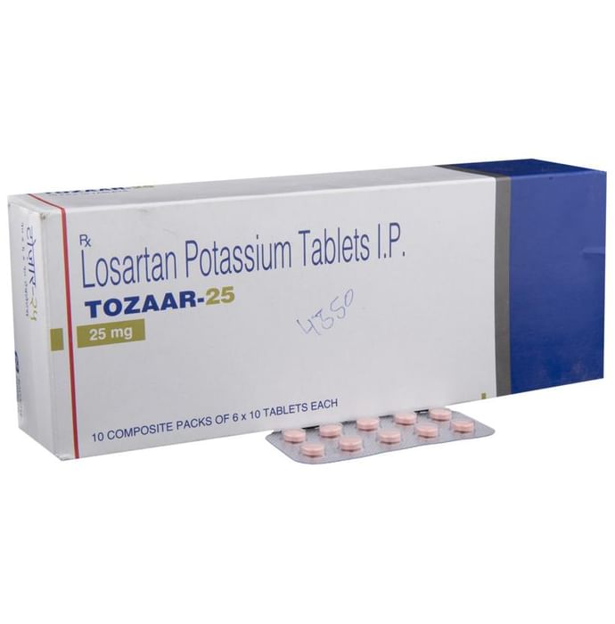 Tozaar 25 Tablet is a medicine used to treat high blood pressure and heart failure. Lowering blood pressure helps to prevent future heart attacks and stroke. This medicine is also effective in preserving kidney function in patients with diabetes. Tozaar 25 Tablet can be prescribed either alone or in combination with other medicines. It may be taken with or without food during the day or at night. However, try to take it at the same time each day to get the most benefit. It is important to continue taking it regularly even if you feel well or if your blood pressure is controlled. Most people with high blood pressure do not feel ill, but if you stop taking this medicine, your condition could get worse. This is a widely used medicine and is considered safe for long-term use. Making some changes in your lifestyle will also help lower your blood pressure. These may include regular exercise, losing weight, smoking cessation, reducing alcohol intake, and reducing the amount of salt in your diet as advised by your doctor. This medicine is tolerated well by most patients and has few side effects. Dizziness, particularly after the first dose, is known to occur in some people. This may be associated with headaches. Let your doctor know if these side effects bother you or do not go away. Before taking this medicine, let your doctor know if you have any kidney or liver problems. Pregnant or breastfeeding mothers should also consult their doctor before taking it. Your doctor may check your kidney function, blood pressure, and potassium levels in your blood at regular intervals while you are taking this medicine.