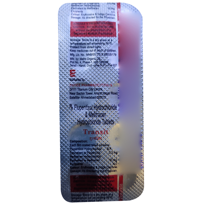 Tranxit Tablet is a combination of two medicines used in the treatment of depression. It helps by increasing the level of chemical messengers in the brain that relaxes the brain and nerves, thus treating your depression. Tranxit Tablet may be taken with or without food. Take it at the same time each day as this helps to maintain a consistent level of medicine in the body. Take it in the dose and duration as advised by your doctor. This medication mustn't be stopped suddenly without talking to your doctor as that may worsen your symptoms. Some common side effects of Tranxit Tablet include dry mouth, constipation, urinary retention, blurred vision, increased heart rate, muscle rigidity, restlessness, and tremor. Initially, this medicine may cause a sudden drop in blood pressure when you change positions, rise slowly if you have been sitting or lying down. It may also cause dizziness and sleepiness, do not drive or do anything that requires mental focus until you know how this medicine affects you. Before taking it, inform your doctor if you are suffering from thyroid or kidney disease, epilepsy, Parkinson’s disease, glaucoma, or any heart disease. This medicine can also lead to weight gain, eat a healthy balanced diet, avoid snacking with high-calorie food, and exercise regularly.