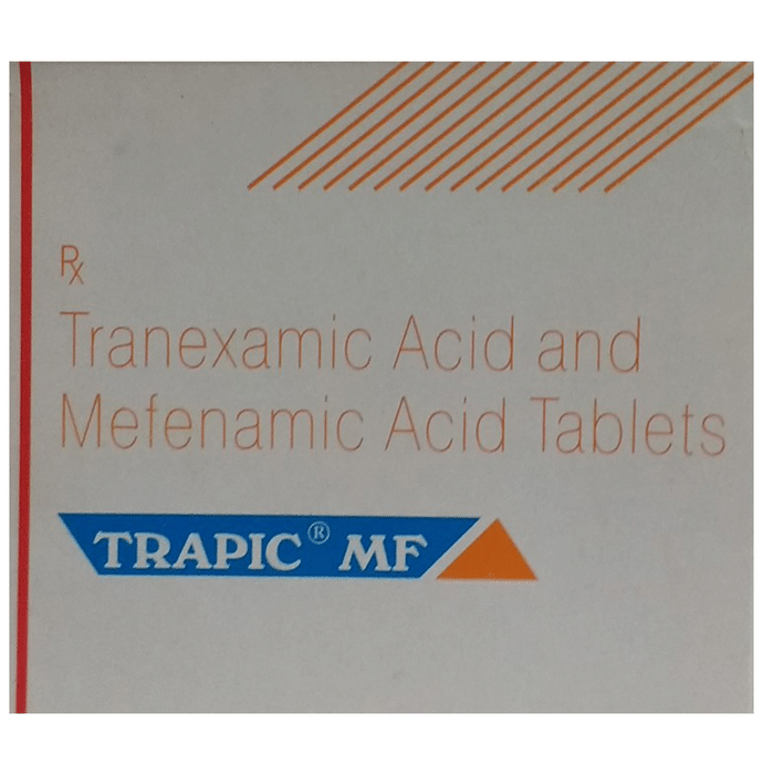 Trapic MF Tablet is a combination medicine used to treat heavy menstrual bleeding and menstrual pain. It prevents the breakdown of blood clots to control excessive bleeding during periods. It also blocks the production of certain chemical messengers that cause pain and inflammation. You can take Trapic MF Tablet at any time of day, with food, but it is best to take it at the same time each day. It should be taken on first day of the periods to get the most benefit. Keep taking it for as long as advised by your doctor. Take this medicine in the dose and duration advised by the doctor and if you have missed a dose, take it as soon as you remember. Remember to finish the full course of treatment even if you feel better. Inform your doctor if you do not observe any change in periods even after 3 consecutive periods. The most common side effects of this medicine include nausea, stomach pain, headache, nasal congestion, sinus pain, sinus inflammation, rash, tiredness, and musculoskeletal (bone, muscle or joint) pain. It may also cause diarrhea, so it is better to take plenty of fluids while taking this medicine as it may help to prevent dehydration. It is advised to consult with your doctor if you do not notice any changes in periods after 3 consecutive periods. Before taking it, let your doctor know if you have any kidney problems or vaginal bleeding disorder. Pregnant or breastfeeding women should also consult their doctor for advice before taking this medicine. You also need to tell your doctor what other medicines you are taking. You might be asked for eye check-ups while taking this medicine. It is advised to avoid alcohol while taking this medicine.