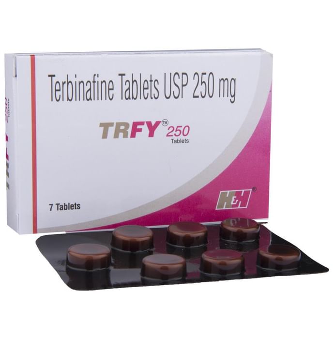 Trfy 250 Tablet belongs to a group of medicines called antifungals It is used to treat a wide range of fungal infections of the skin and nails, including ringworm. It works by killing the fungi that cause the infection. Trfy 250 Tablet can be taken with or without food. You should take it regularly as prescribed by your doctor. Taking it at the same time every day will help you to remember to take it. The dose and duration of treatment will depend on what you are being treated for. Do not stop taking it until you have finished the complete course, even when you feel better. If you stop taking this medicine too early, the fungus may continue to grow and the infection may return or worsen. This medicine's most common side effects include rash, headache, nausea, and abnormal liver enzyme. These are usually mild but let your doctor know if they bother you or last more than a few days. Before using it, you should tell your doctor if you are allergic to any antibiotics or have any kidney or liver problems. You should also let your healthcare team know all other medicines you are taking as they may affect, or be affected by this medicine. Pregnant and breastfeeding mothers should consult their doctor before using it. Your doctor will monitor your liver function regularly during treatment.