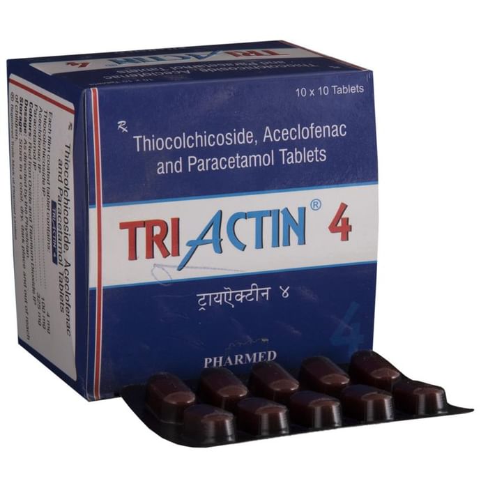 Triactin 4 Tablet is a combination medicine that helps in relieving muscular pain. It works by blocking the release of certain chemical messengers that cause pain, inflammation, and fever. This improves the movement of muscles and provides relief from pain and discomfort. Triactin 4 Tablet should be taken with food. This will prevent you from getting an upset stomach. The dose and duration will depend on the severity of your condition. You should keep taking the medicine even if you feel better until the doctor says it is alright to stop using it. Using this medicine may cause few common side effects such as nausea, vomiting, heartburn, stomach pain, diarrhea, loss of appetite, and dryness in the mouth. If any of these side effects do not resolve with time or get worse, you should let your doctor know. Your doctor may be able to suggest ways of preventing or reducing the side effects. In general, you should try to use the smallest amount necessary to control your symptoms. Before using the medicine, you should tell your doctor if you have any other medical conditions or disorders. To make sure it is safe, you should let your doctor know all the other medicines you are taking. Also, tell your doctor if you have any problems with your liver or kidneys. You should avoid the consumption of alcohol while on treatment with this medicine. Pregnant and breastfeeding women should consult their doctors first before using the medicine.