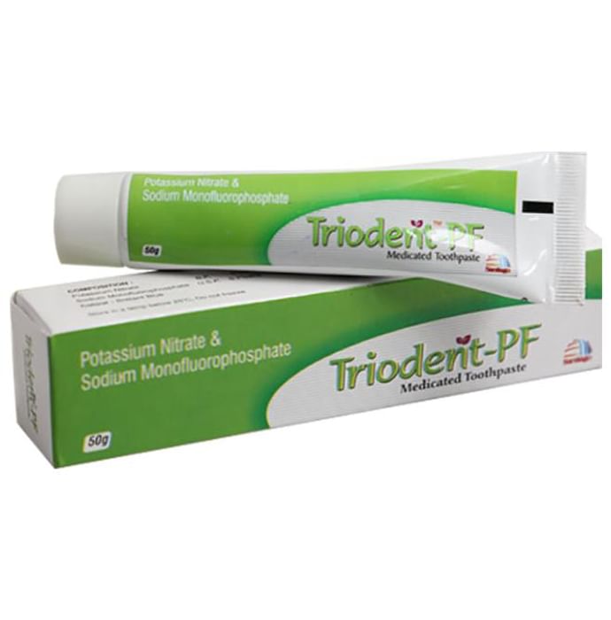 Triodent-PF Toothpaste is a combination of two medicines is used to treat dental cavities. It reduces the pain and sensitivity while having cold and hot food items. It also makes the teeth stronger and prevents cavities in the future. Triodent-PF Toothpaste is strictly advised for external use only. Use it in the dose and duration advised by your doctor. Apply it only to the affected teeth. It should not be used in excess amount. Avoid swallowing the medicine. In case of accidental contact with your eye, rinse it off with plenty of water. This medicine is generally safe and does not usually cause any common side effects. However, if you experience any allergic reactions such as itching, swelling, and rashes, consult a doctor dimmediately.