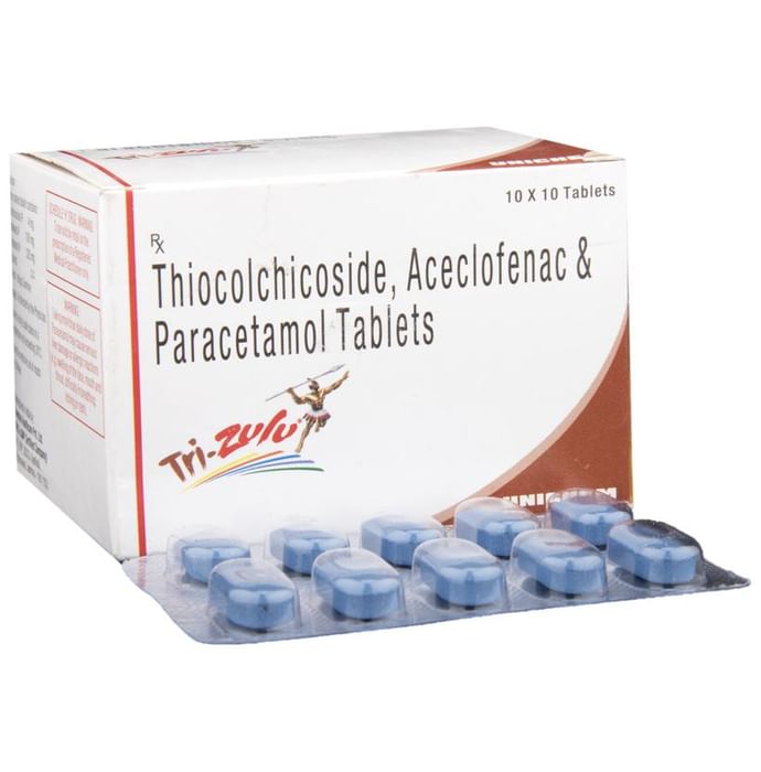Trizulu Tablet is a combination medicine that helps in relieving muscular pain. It works by blocking the release of certain chemical messengers that cause pain, inflammation, and fever. This improves the movement of muscles and provides relief from pain and discomfort. Trizulu Tablet should be taken with food. This will prevent you from getting an upset stomach. The dose and duration will depend on the severity of your condition. You should keep taking the medicine even if you feel better until the doctor says it is alright to stop using it. Using this medicine may cause few common side effects such as nausea, vomiting, heartburn, stomach pain, diarrhea, loss of appetite, and dryness in the mouth. If any of these side effects do not resolve with time or get worse, you should let your doctor know. Your doctor may be able to suggest ways of preventing or reducing the side effects. In general, you should try to use the smallest amount necessary to control your symptoms. Before using the medicine, you should tell your doctor if you have any other medical conditions or disorders. To make sure it is safe, you should let your doctor know all the other medicines you are taking. Also, tell your doctor if you have any problems with your liver or kidneys. You should avoid the consumption of alcohol while on treatment with this medicine. Pregnant and breastfeeding women should consult their doctors first before using the medicine.