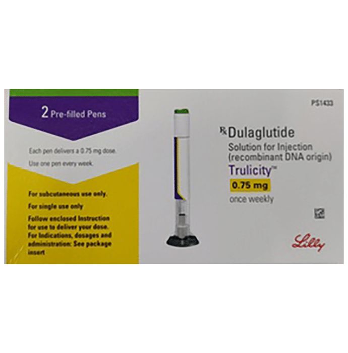 Trulicity 0.75mg Pre-Filled Pen is an injectable medicine used to lower blood glucose levels in adults with type 2 diabetes. It works by helping your body produce insulin and reducing the amount of sugar your liver makes. The dose of Trulicity 0.75mg Pre-Filled Pen will depend on your condition and what other diabetes medicines you are taking. You can use it at any time of day with or without food but try to use it on the same day each week to get the most benefit. Your doctor or nurse will show you how and where to inject the medicine. Follow the instructions carefully. Do not stop taking this medicine without talking to your doctor. If you do, your blood glucose levels may increase and put you at risk of serious complications. It should be used with a proper diet and exercise to control high blood glucose. This medicine should be stored in a fridge until you need it but do not freeze it. The most common side effects of this medicine include nausea, diarrhea, stomach pain, and loss of appetite. It can also lead to hypoglycemia (low blood sugar level) especially if you are taking other medicines to lower blood sugar. Make sure you know how to recognize and deal with it. Before using this medicine, talk to your doctor if you have ever had liver or kidney disease, pancreatitis, or stomach problems. Also, tell your doctor if you are taking any other medicines which may affect the way this medicine works. If you are pregnant or breastfeeding, ask your doctor if it is safe to take Trulicity 0.75mg Pre-Filled Pen.