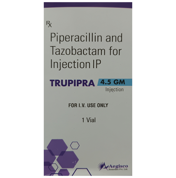 Trupipra 4.5gm Injection is a combination of two antibiotics. It is used to treat various types of bacterial infections. It fights against the infection by killing the microorganisms. Trupipra 4.5gm Injection is generally administered by a healthcare professional and should not be self-administered. Depending on the severity of your underlying illness, your doctor will decide the precise dose and schedule as per which this injection is to be given. It is strictly advised to be used as per the doctor’s prescription. Some of the common side effects of this medicine include nausea, vomiting, diarrhea, and rash. Additionally, you may notice some injection site reactions like pain, swelling, or redness. You should consult your doctor if these side effects do not get better with time and persist for a longer duration. Before using the medicine, you should tell your doctor if you are allergic to any antibiotics or have any kidney or liver problems. Your doctor may change the dose or prescribe a different medicine. This medicine is generally considered safe to use during pregnancy and breastfeeding if used under a doctor’s supervision.