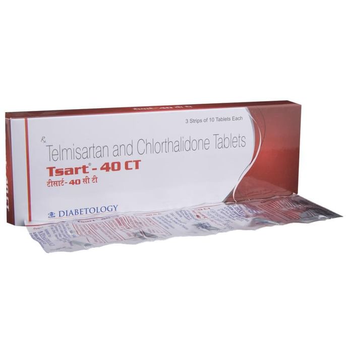 In Hypertension (high blood pressure) Tsart 40 CT Tablet is a combination of two medicines namely Telmisartan and chlorthalidone. It is generally used when one medicine alone is not controlling your blood pressure effectively. Telmisartan works by relaxing and widening your blood vessels so your blood can flow more easily. This will lower your blood pressure. Chlorthalidone is known as a diuretic (water pill) which increases urine output thereby lowering blood pressure. If your blood pressure is controlled you are less at risk of having a heart attack, stroke, or kidney problems. The medicine must be taken regularly as prescribed to be effective. You do not usually feel any direct benefit from taking this medicine, but it works in the long term to keep you well.