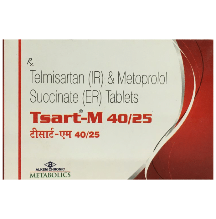 Tsart-M 40/25 Tablet ER is a medicine used for treating high blood pressure. By lowering blood pressure, it helps in preventing future heart attacks and strokes. Early treatment with this medicine also improves the chances of survival in patients with heart attacks. It is advised to take Tsart-M 40/25 Tablet ER with food at a fixed time each day to maintain consistent levels of medicine in the blood. Keep taking it for as long as advised by your doctor. Even if you feel well, do not stop this medicine on your own because high blood pressure often has no symptoms. If you stop taking it, your condition may get worse. Keeping active with regular exercise, reducing your weight and eating a healthy diet will also help control your blood pressure. Follow your doctor’s advice while taking this medicine. Some common side effects of this medicine include headache, weakness, dizziness, decreased blood pressure, and increased potassium level in blood. It is advised to avoid potassium rich food and supplements while taking this medicine. It may cause dizziness, avoid driving or rise slowly from the sitting position. You may be asked for regular monitoring of blood pressure, blood sugar level, kidney functioning, urea, or electrolytes level during the treatment. Before taking it, let your doctor know if you have any liver or kidney problems. Pregnant or breastfeeding women should also consult their doctor for advice before taking this medicine. You also need to tell your doctor what other medicines you are taking especially those used to treat high blood pressure or heart conditions.