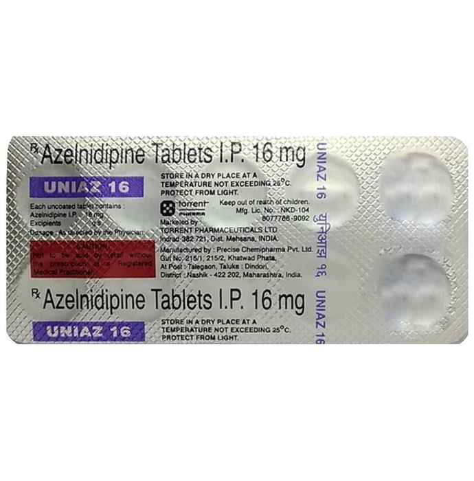 Uniaz 16 Tablet is a medicine used to treat high blood pressure (hypertension). It belongs to a class of medicines known as calcium channel blocker which helps to lower blood pressure and reduce the workload of the heart. This helps prevent heart attacks and strokes. Uniaz 16 Tablet may be prescribed alone or along with other medicines. The dose depends on your blood pressure levels and the severity of your condition. You can take it at any time of the day, with or without food, but it is best to take it at the same time each day. Keep taking it for as long as advised by your doctor. Do not stop this medicine on your own, even if you feel well because high blood pressure often has no symptoms. This makes it hard to identify any sudden spike and if you stop taking it, your condition may get worse. Keeping active with regular exercise, reducing your weight, and eating a healthy diet will also help control your blood pressure. Follow your doctor’s advice while taking this medicine. Studies have shown that it also has a protective effect on the heart. The most common side effects include nausea, headache, edema (swelling in the feet or ankles), and dizziness. Consult your doctor if any of these bother you, or do not go away. They may be able to suggest ways to reduce the side effects. Before taking it, let your doctor know if you have any liver, heart, or kidney problems. Pregnant or breastfeeding women should also consult their doctor for advice before taking this medicine. You also need to tell your doctor what other medicines you are taking, especially those used to treat high blood pressure or heart conditions. You should have your blood pressure checked regularly to make sure that this medicine is working properly.