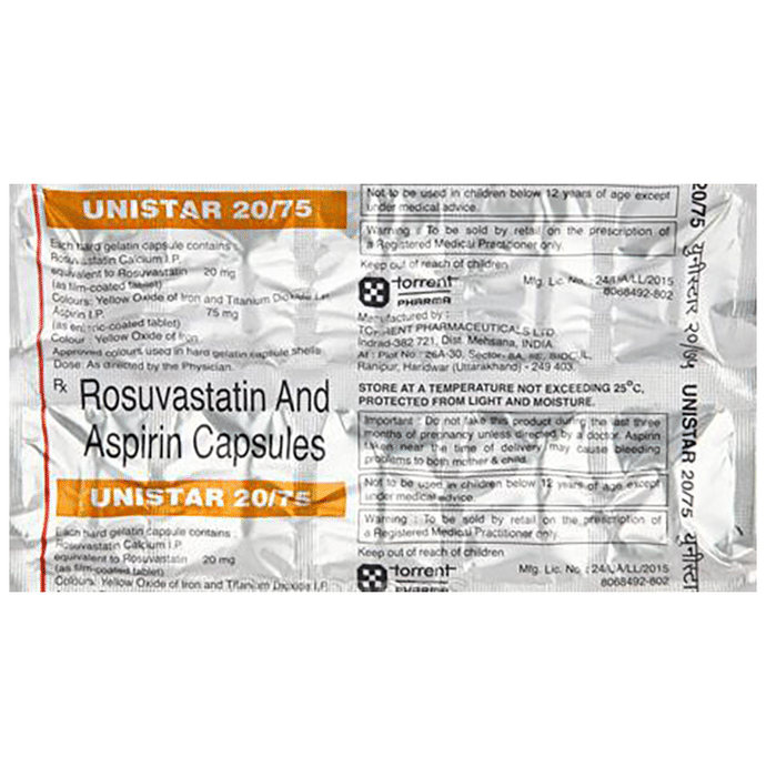 Unistar 20/75 Capsule is a combination of two medicines used to prevent heart attack and stroke. This medicine reduces the "bad" cholesterol (LDL) and triglycerides (fats) levels. Moreover, it also decreases the formation of blood clots. Unistar 20/75 Capsule should be taken with food to avoid stomach upset. You should take it regularly at evenly spaced intervals as per the schedule prescribed by your doctor. Taking it at the same time every day will help you remember to take it. The dose and duration of treatment will depend on what you are being treated for. Do not stop taking it until you have finished the complete course, even when you feel better. Lifestyle changes like low-fat diet, exercise and not smoking may help this medicine to work better. Nausea, abdominal pain, headache, and constipation are some common side effects of this medicine.This medicine increases your risk of bleeding, so it is important to be careful while shaving, cutting nails, using sharp objects, or engaging in contact sports (e.g., football, wrestling). Let your doctor know if you notice yellowing of skin, muscle pain or dark urine. Before taking this medicine, tell your doctor if you have liver or kidney disease or you are suffering from bleeding disorder. You must tell your doctor if you are pregnant, planning pregnancy or breastfeeding. You should also let your healthcare team know all other medicines you are taking as they may affect, or be affected by this medicine.