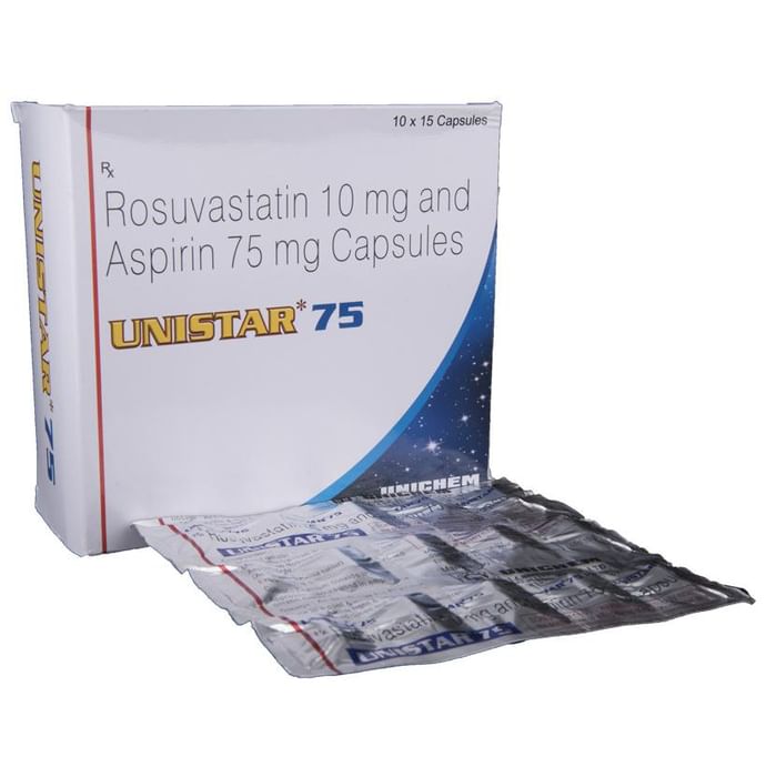 Unistar 75 Capsule is a combination of two medicines used to prevent heart attack and stroke. This medicine reduces the "bad" cholesterol (LDL) and triglycerides (fats) levels. Moreover, it also decreases the formation of blood clots. Unistar 75 Capsule should be taken with food to avoid stomach upset. You should take it regularly at evenly spaced intervals as per the schedule prescribed by your doctor. Taking it at the same time every day will help you remember to take it. The dose and duration of treatment will depend on what you are being treated for. Do not stop taking it until you have finished the complete course, even when you feel better. Lifestyle changes like low-fat diet, exercise and not smoking may help this medicine to work better. Nausea, abdominal pain, headache, and constipation are some common side effects of this medicine.This medicine increases your risk of bleeding, so it is important to be careful while shaving, cutting nails, using sharp objects, or engaging in contact sports (e.g., football, wrestling). Let your doctor know if you notice yellowing of skin, muscle pain or dark urine. Before taking this medicine, tell your doctor if you have liver or kidney disease or you are suffering from bleeding disorder. You must tell your doctor if you are pregnant, planning pregnancy or breastfeeding. You should also let your healthcare team know all other medicines you are taking as they may affect, or be affected by this medicine.