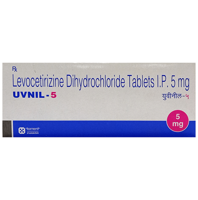 Uvnil 5 Tablet belongs to a group of medicines called antihistamines. It is used to treat various allergic conditions such as hay fever, conjunctivitis, some skin reactions such as eczema, hives, and reactions to bites and stings. It also relieves watery eyes, runny nose, sneezing, and itching. Uvnil 5 Tablet can be taken with or without food. The dose required by you may vary depending on what you are taking it for. This medicine is usually taken in the evening, but follow the advice of your doctor on how to take it. You may need this medicine only on days you have symptoms, but if you are taking it to prevent the symptoms then you should take it regularly. If you miss doses or stop taking it earlier than advised, your symptoms may come back. This medicine is generally very safe. The most common side effects include feeling sleepy or dizzy, dry mouth, fatigue, and headache. These are usually mild and go away after a couple of days as your body adjusts to it. Consult your doctor if any of the side effects persist or worry you. Before taking it, tell your doctor if you have any kidney problems or epilepsy (seizures). Your dose may need to be modified or this medicine may not suit you. Some other medicines can interact with this medicine so let your healthcare team know what else you are taking. You should also talk to your doctor before using this medicine if you are pregnant or breastfeeding, although it is not thought to be harmful.