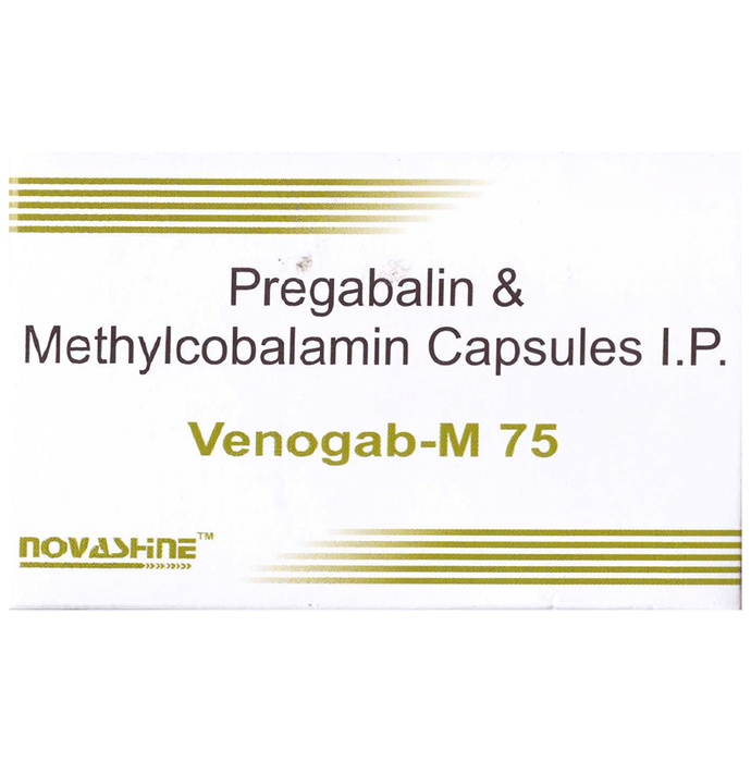 Venogab-M 75 Capsule is a prescription medicine used for the treatment of neuropathic pain. It decreases pain by modulating calcium channel activity of the nerve cells. This medicine also protects nerve fibers and heal damaged nerve cells. Venogab-M 75 Capsule is taken by mouth with or without food, preferably at bedtdime. It is advised to take it at the same tdime each day as this helps to maintain a consistent level of medicine in the body. Take this medicine in the dose and duration advised by your doctor as this is a habit-forming medicine. If you miss a dose of this medicine, take it as soon as you remember. Finish the full course of treatment even if you feel better. It is dimportant that this medication is not stopped suddenly without talking to the doctor. Some common side effects of this medicine include dizziness and sleepiness, so do not drive or do anything that requires mental focus until you know how this medicine affects you. The side effects are mild in nature and get dimprove with tdime. This medicine may cause weight gain and to control it, you should exercise regularly and take a balanced diet. It is dimportant to inform your doctor if you develop any unusual changes in mood or behavior, new or worsening depression, or suicidal thoughts. Your doctor should also know about all other medicines you are taking as many of these may make this medicine less effective or change the way it works. Inform your doctor if you are pregnant, planning pregnancy, or breastfeeding.